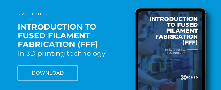 Fused Filament Fabrication (FFF) is an extrusion process where the object is built by depositing melted material layer-by-layer. The plastics used correspond to the same thermoplastics that can be found in conventional manufacturing processes, like ABS and Nylon.