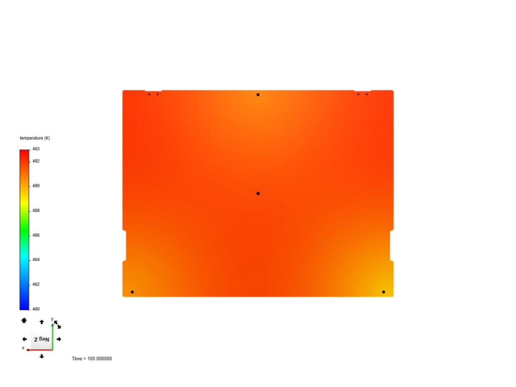 - Verbesserte Wärmeverteilung auf der Druckoberfläche – dank des neuen Silikon-Thermopads, das anstelle des PCB-Heizelements verwendet wird, des eliminierten Luftspalts und der neuen Aluminium-Plattform, wie bei der BCN3D Epsilon-Serie. Im Bild unten ist die Wärmeverteilung zu sehen, mit einer kleinen Abweichung von ca. 2ºC im Vergleich zu 20ºC bei früheren Sigmax R19s.